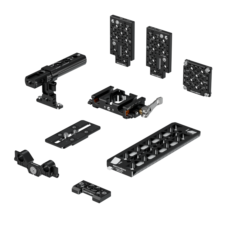 The Advanced Kit for Sony VENICE Extension System Mini is designed to be compatible with that camera extension block alone, with the accessory plates designed to match the camera’s shape and size. The LeftField Mini Baseplate and Riser are compatible with other cameras and setups – please see their respective pages for details on compatibility. The Top Bar Bracket and Top Handle are universally compatible, and can be repurposed with other camera setups.
