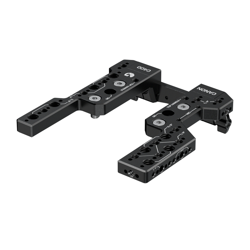 There are side-mounted 1/4″-20 points for attaching Cheese Plates or other third-party accessories, and has a dedicated channel for the Canon C400 Top Plate Filler. The Top Plate also provides alternate mounting for the C400 microphone shockmount and the stock C400 top handle.
